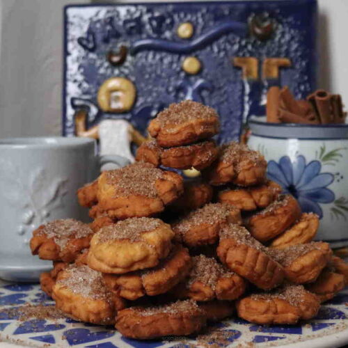 Następnie ciasto odstawiamy na kwadrans, po czym rozwałkowujemy je na grubszy placek i wycinamy z niego kółka. Każdą porcję nacinamy wzdłuż brzegów i smażymy na rozgrzanym tłuszczu. Smażone zawiń w cukier i cynamon.